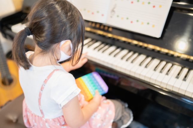 大好きなプッシュアップを片手に、「楽譜のドレミと対応した色とピアノを一緒に弾く」という、生徒ちゃんオリジナルの遊びをしています😂